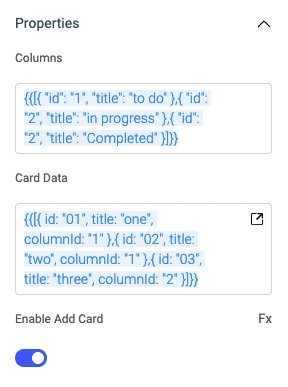 * init kanban board widget * kanban board * reverts to beautifully * kanban UI updates and dnd fixes * bugfix: when dropped outside the col, should return back to it inital position * updates min-width of the column * container and widget styles * style fixes: column container onDrag * adds button for new group * fixes new card overflow * add btn for adding cards * groups and cards updated * add property definition * improves draggable card position while drag is active * handle delete group/col * handle col/group title updates * handles editing card title * style fixes for input cursor * cleanup * card popover with codehinter fields * minor card fixes * updates exposed variable * simplify boardData into cols and cards * adds width and min-width style definations * build board from queries * handle draggable rbd-id * removes add group card and delete group option * fixes typos * show empty state message * fixes typos * removes card extra border color * fixes column typi and cards updates issue * adds enableAddCard property defination * adds accent color options * default style accent color * accent color fix * revets popover with hinter * fixes card drag and drop * removes hook * fixes: state synced with property defination updates(col and cards data) * fixes: on re-arranging the card via dnd, update the card content * handles if card columnId is updated * adds card container layer * clean up * dark theme * fixes card onDrop issue * renamed the exposed variable data --> lists * adds custom resolvers to the popover * handle widget crash when non iterables are passed * updates default card and col value * fixes dnd issues for dynamic card values * refactor: cleanup * handles empty and undefined cardData * fixes Height of widget is changing when popover thing is displayed. * fixes: updating card data in widget inspector * fixes: updating column data in widget inspector * fixes adding cards for newly created groups/columns * clean up * Add kanban event onCardAdded and expose lastAddedCard * Add onCardRemoved action and expsed lastRemovedCard variable * Add events and variables for card movement and selection * Add card edit feature for kanban widget * Rename lastAddedRemoved to lastRemovedCard in kanban * Rename lists to columns on kanban board * Set max height of kanban column to respond to widget height * Have "Add description" link if there is no description for Kanban cards * kanban docs * Change text from "add +" to "Add card" on kanban * Validate card data before update * Add tip about card id type on kanban documentation * Add default min width and width for kanban Co-authored-by: Sherfin Shamsudeen <[email protected]> Co-authored-by: Shubhendra <[email protected]>